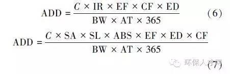 參考土壤重金屬評價模型,本研究設定2種暴露途徑:①通過手-口直接攝入;②通過皮膚接觸攝入.其中,手-口攝食途徑和皮膚接觸途徑下的攝入量(AOD)計算公式分別如式(6)和(7)所示.
