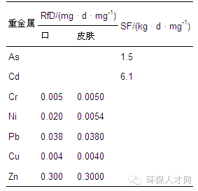 本次研究相關的污染物的毒性數據主要來源于國際癌癥研究機構(IARC)和世界衛生組織(WHO),As、Cd 為化學致癌物,其致癌強度斜率因子(SF值)和評價模型各重金屬RfD 值如表 6所示.