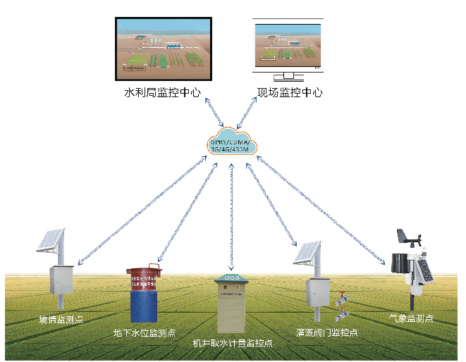 節(jié)水增糧信息化監(jiān)控系統(tǒng)基于機井取水計量監(jiān)控、地下水位監(jiān)測、土壤墑情監(jiān)測、田間氣象監(jiān)測、灌溉自動控制等系統(tǒng)進(jìn)行多功能設(shè)計,采用GPRS/CDMA或433MHZ的無線通信方式,實現(xiàn)監(jiān)控中心對多測點的遠(yuǎn)程監(jiān)控,為農(nóng)田水利管理和水資源監(jiān)管提供了可靠的技術(shù)保障。